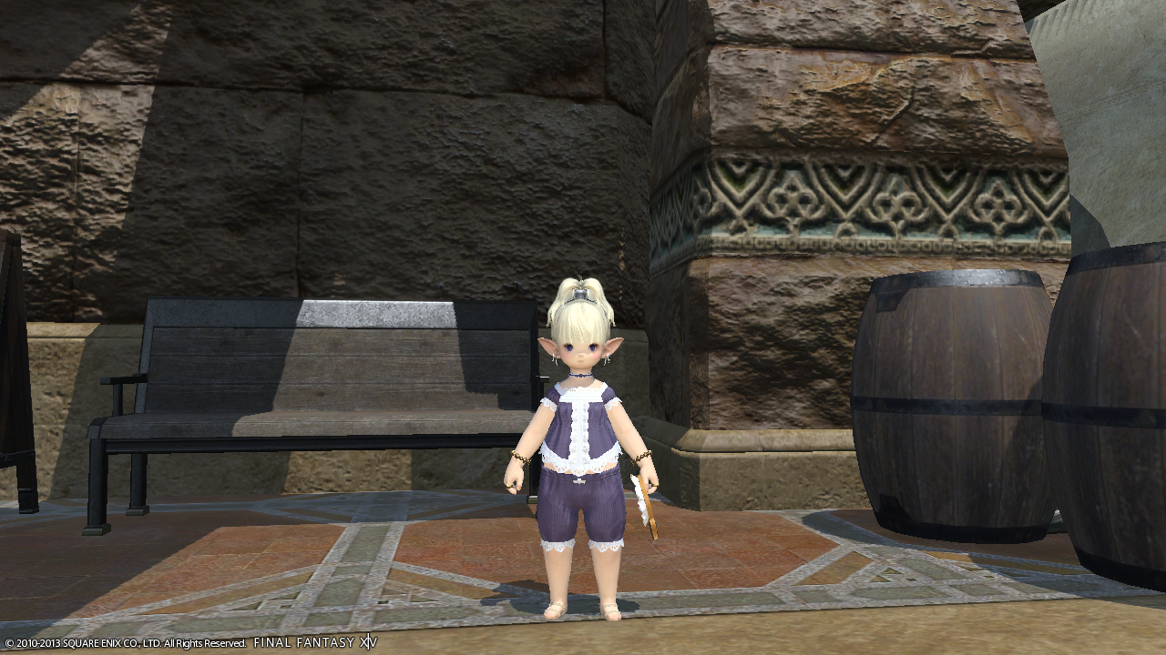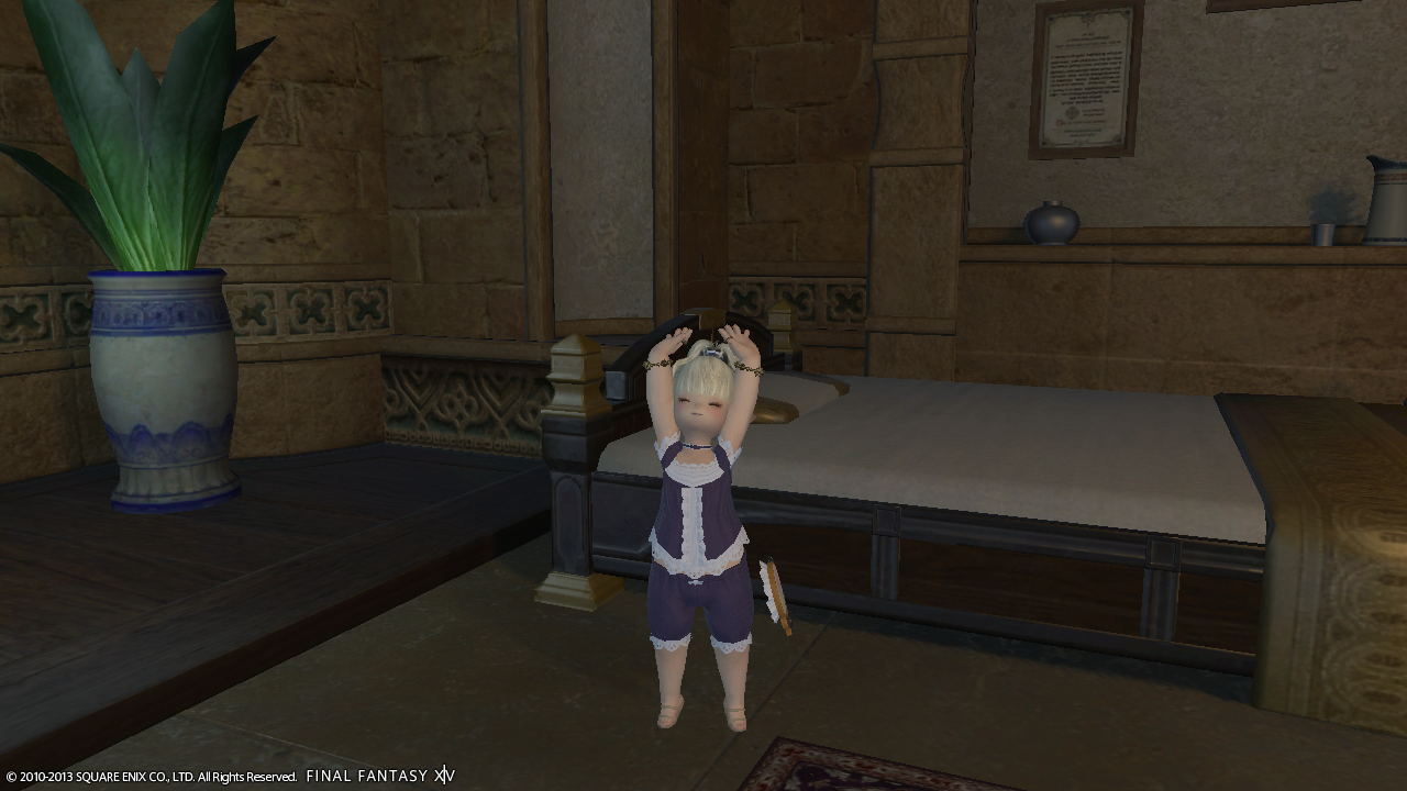 ララフェルが、カミーズを着るとすっごく可愛いと思うなり。ただ染色してない状態が、かっこよく言えば「ペールオレンジ」かっこわるく言えば「肌色」なので、染色したほうが良いかもしれません。白だと可愛いだろうなぁ…白い染料ないけど。今回は「グルームパープル」で染色してみました。なんとなく『部屋着』風になりました。1枚目:染色してないカミーズ&パンタレット2枚目:グルームパープルで染色3枚目は脚装備を変えてみた。こういうカッコの人、リアルで居そう。4枚目:宿屋でうとうと…。5枚目:「朝だーーーー、今日も頑張るよ!」エモを上手く使うと、色々な「お部屋でくつろぐ楽しい写真」が撮れそうです